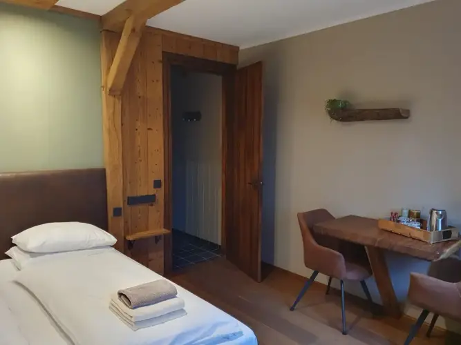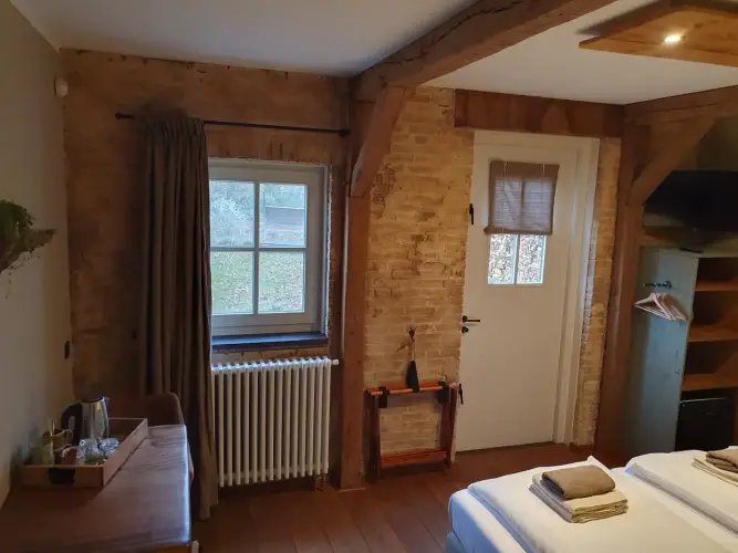 Deze kamer op de begane grond heeft directe toegang tot de gastentuin en een prive terras. Deze kamer is voorzien van een ruime douche.